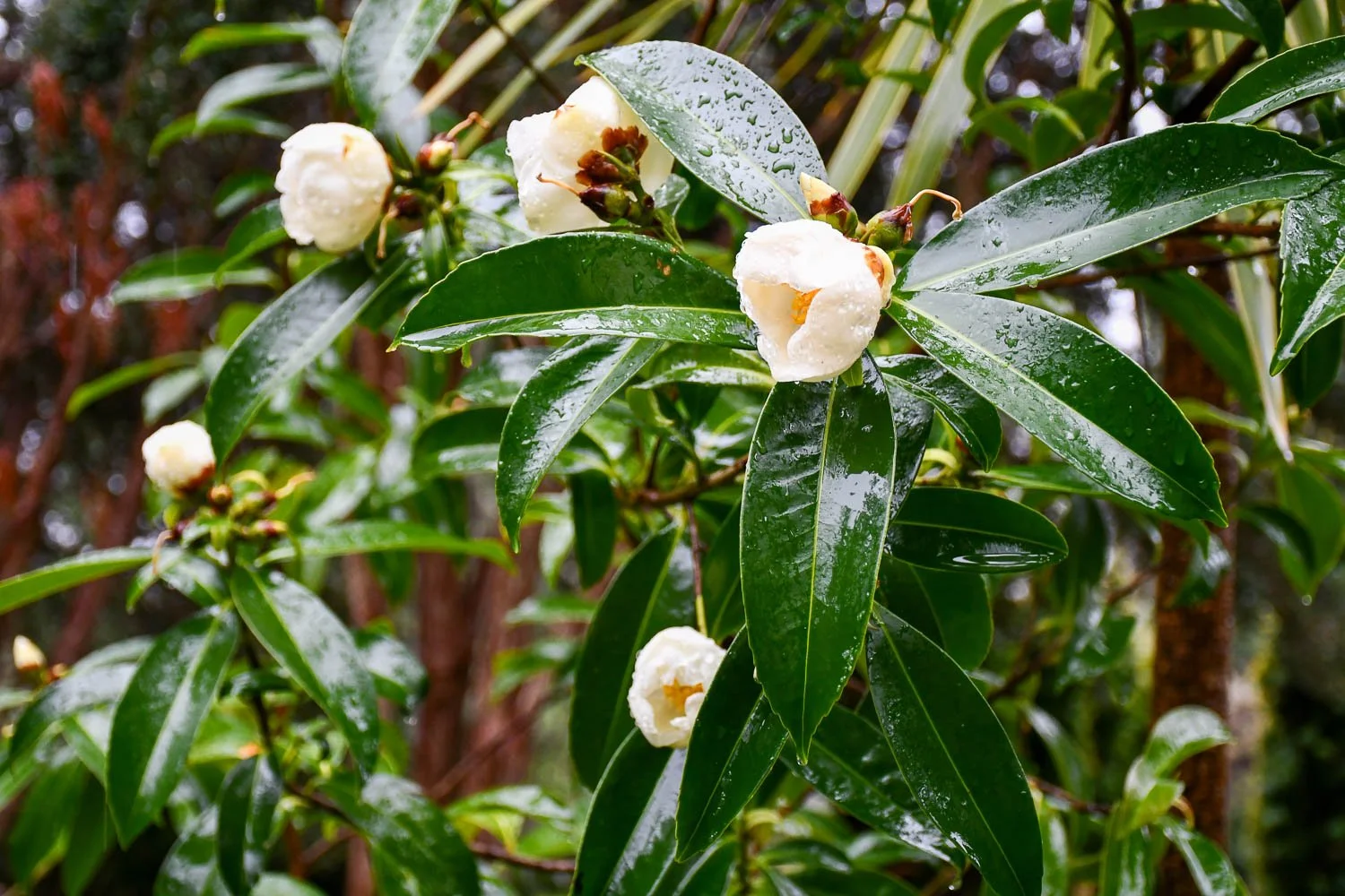 I saw silvery camellia-like foliage and asked if that was what it was. Sure enough, Richie said this was Camellia sasanqua ‘Silverado’ (sasanqua camellia). He said it can be difficult to root.