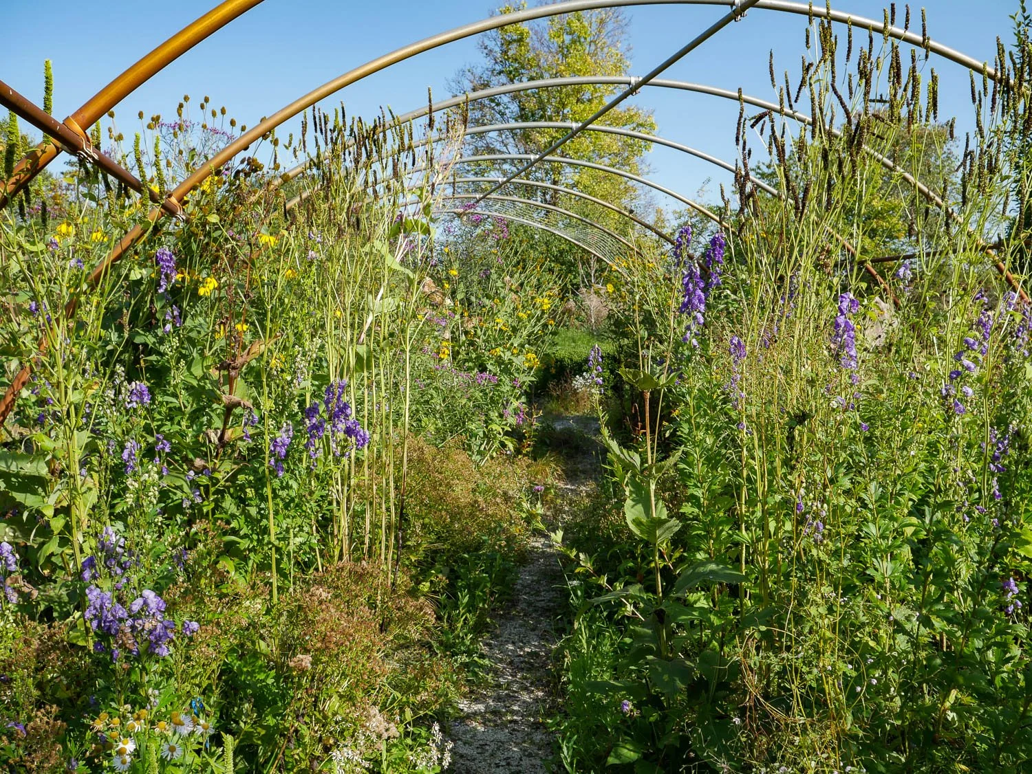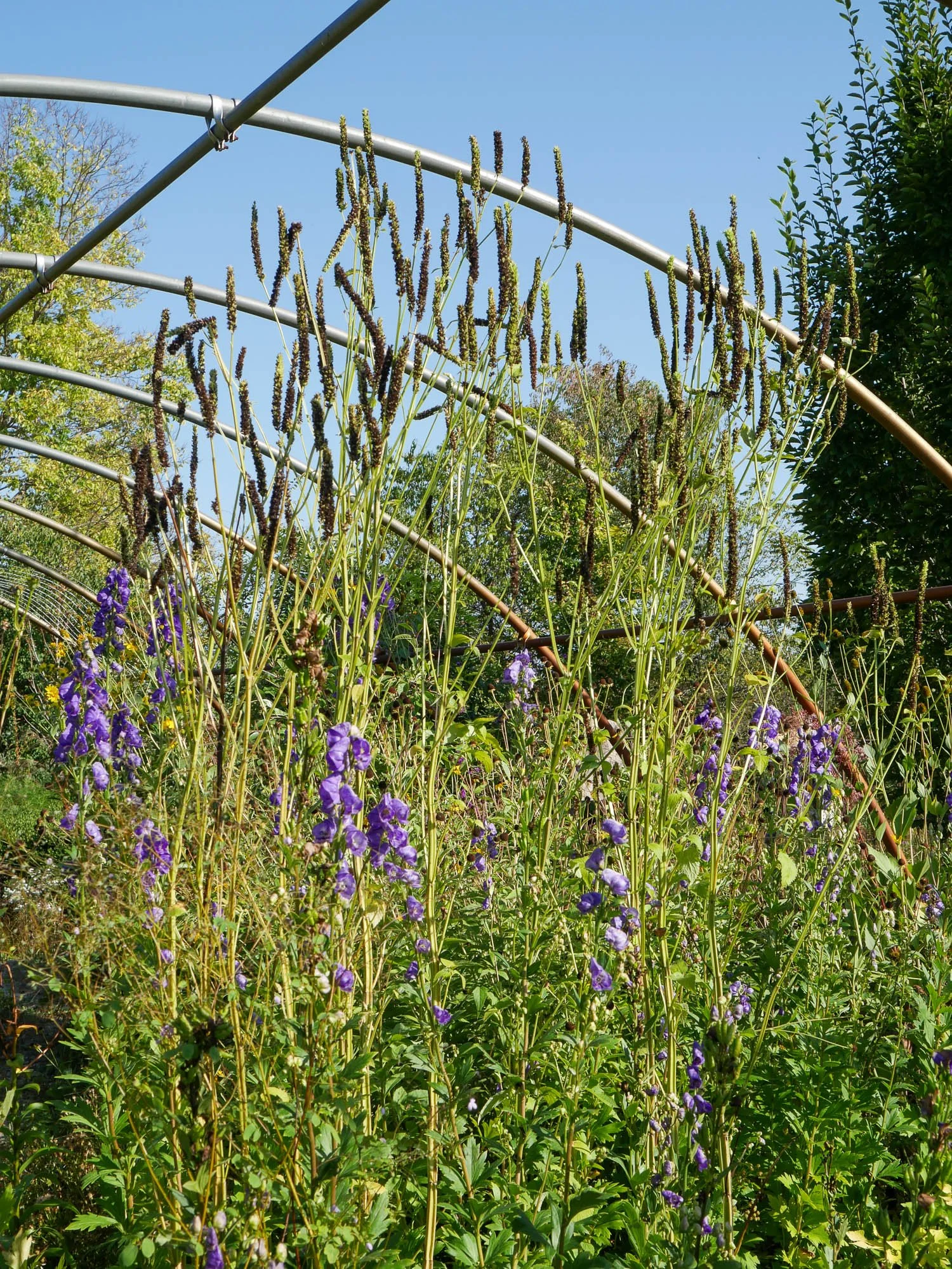 Further back, tall Agastache nepetoides (yellow giant hyssop) made you feel enclosed. I’m hoping I can find some seed from a southern provenance of this species. I think this visit was the first time I’ve seen Aconitum carmichaelii (Chinese monkshood) bloom. They were about eye level with me.