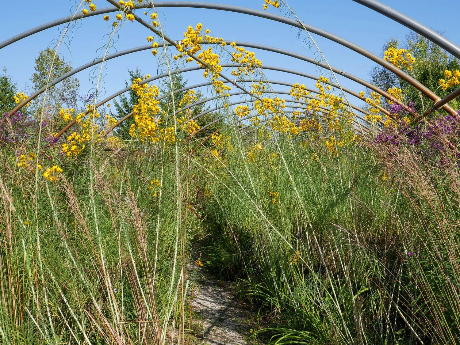 Brent read that and saw the pictures, and he wrote me saying that he wanted to create his own exotic garden with a prairie flair. He framed his garden not with a hedge but instead the old frame of a Quonset hut, and the space was packed with plants. Inside you felt lost in a prairie even though a whole nursery surrounded you.