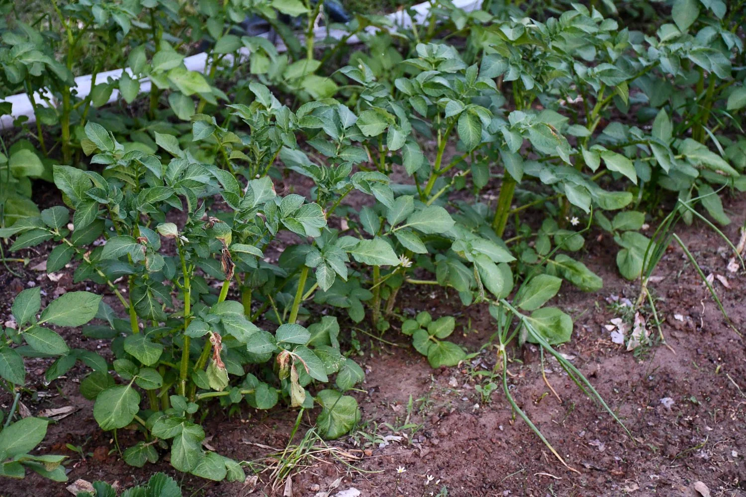 A few days after the freeze, the potatoes look healthy. Note a few brown leaves where the foliage touched the frost cloth.
