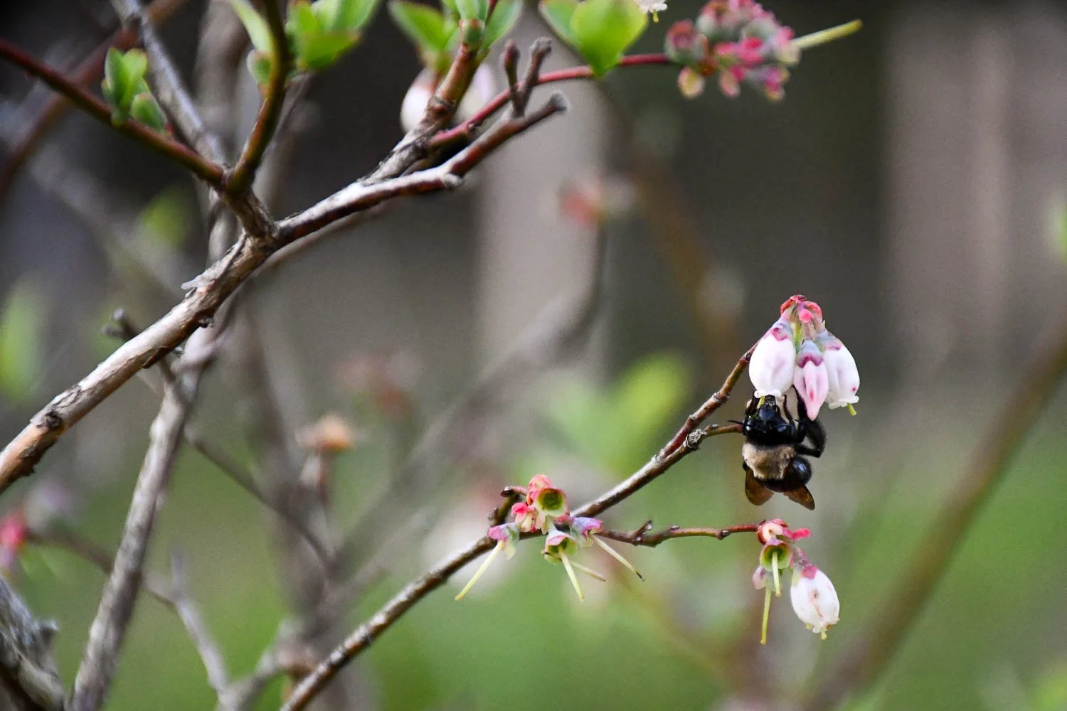 A few days after the freeze, bees are still working the blueberry flowers.