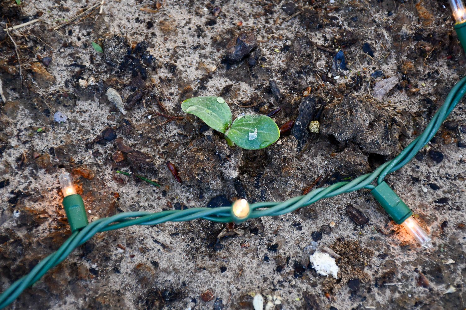 Zucchini seedlings made it with the Christmas lights.