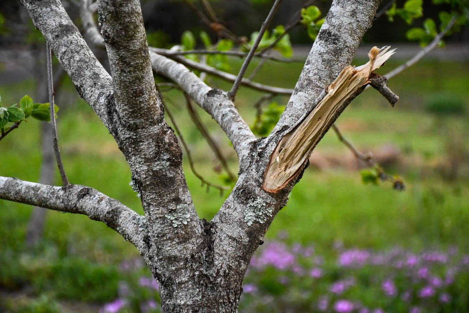 A gash on the persimmon tree from the ice load. This damage makes me question if I would spray them with water again.