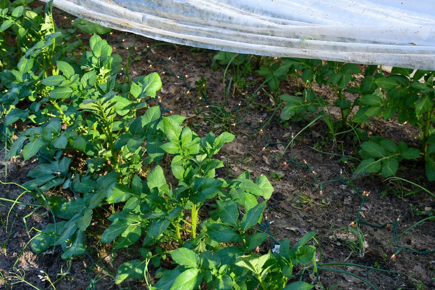 Potatoes are still alive the morning of the freeze with the floating row cover and Christmas lights.