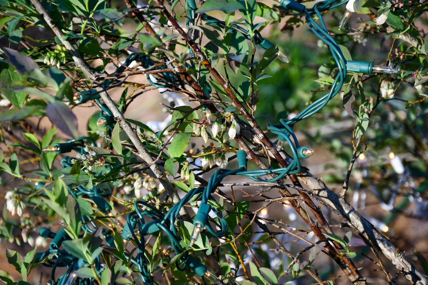 Covering blueberries with blankets and Christmas lights (absolutely yes!). I threw two strands of Christmas lights on two blueberry shrubs, and then covered them with old blankets. The recommendation with blankets or other coverings is that it has to cover the plant all the way to the ground. However, the blankets weren’t that big, which meant they were suspended on the plants with a gap at the base. The Christmas lights were able to produce enough warmth that it protected them! The two blueberries I lit and covered are still in flower now a few days later, and the fruit appear just fine. There’s another blueberry bush that I did not cover as a control a few feet away, and the fruit have turned brown on them.