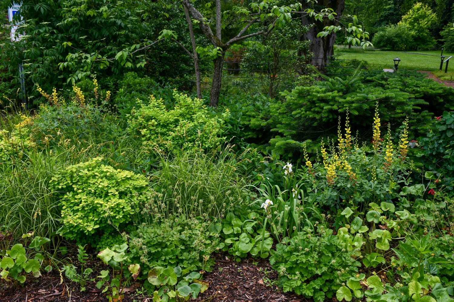Near the garden entrance, it was apparent that natives would be at the forefront of our visit. Here Baptisia ‘Solar Flare’ brightens this edge planting.