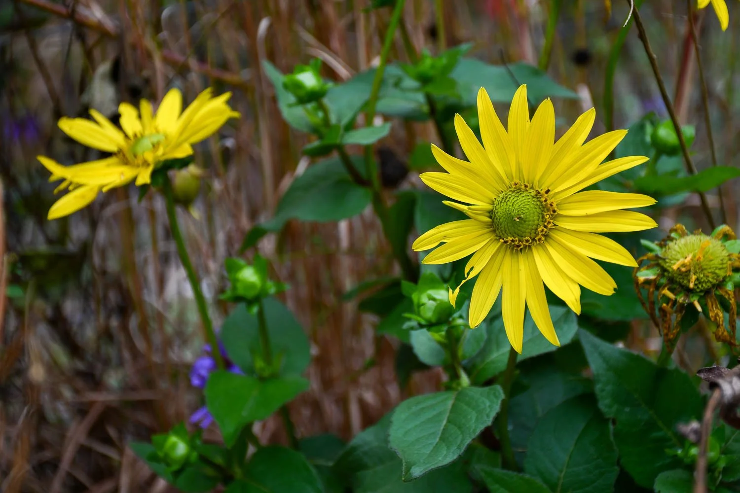 There are other flowers still in bloom around the garden, and the insects have no trouble finding the last flowers of the season. Symphyotrichum lanceolatum (panicled aster) is one of my latest asters to flower, and it is swarmed with pollinators. The Monarchs that have come through the past several weeks flock to its pale pink blooms. And, there are others that are sporting blooms—the last blue spikes on Salvia farinacea ‘Henry Duelberg’ (mealycup sage), a late Echinacea purpurea (purple coneflower), and out of season blooms on a juvenile Silphium perfoliatum (cup plant).
