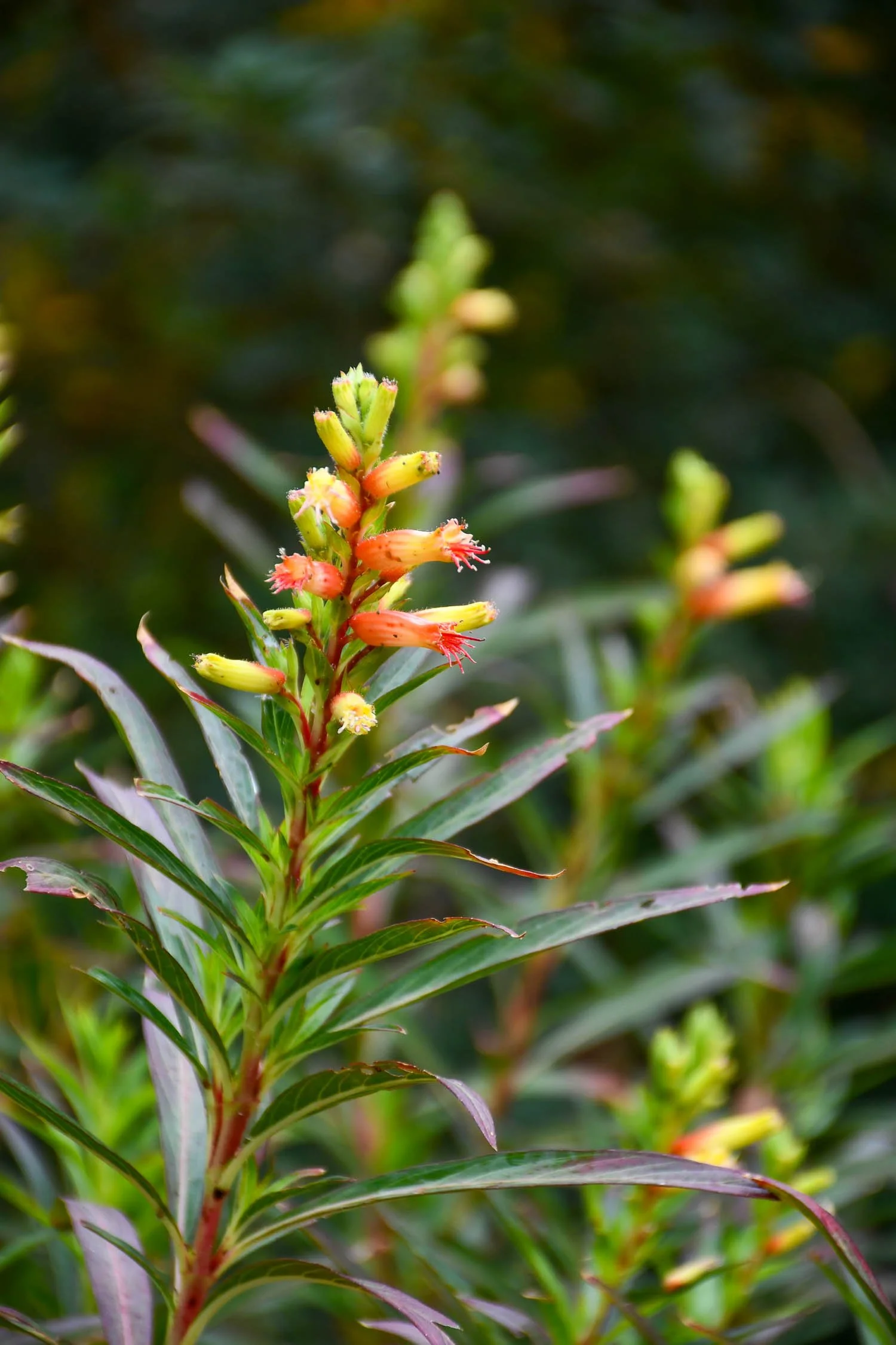 A few candy corn flowers hang on Cuphea micropetala (candy corn cuphea).