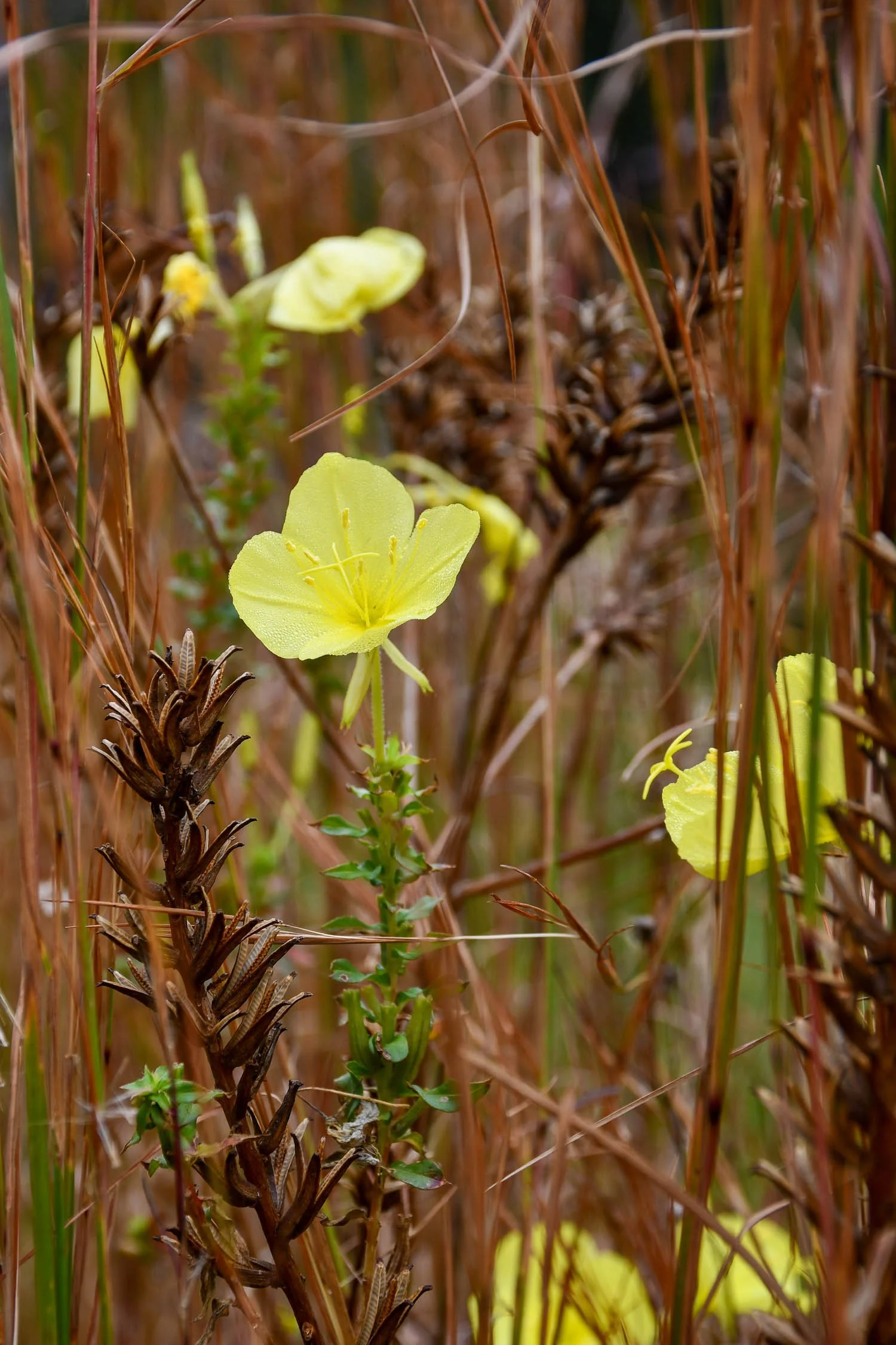 And, the orange combines nicely with the nearby fall color on Taxodium distichum (bald cypress), Prunus persica ‘Junegold’ (peach), and Andropogon virginicus (broomsedge) that we have. There are late flowers on Oenothera rhombipetala (four-point evening primrose), which I just welcomed to the garden this year. And, with the split seed capsules, it appears I’ll have plenty next year. Even a little Acalypha virginica (copperleaf) weed is growing on me as it too is getting in on the fall color action.