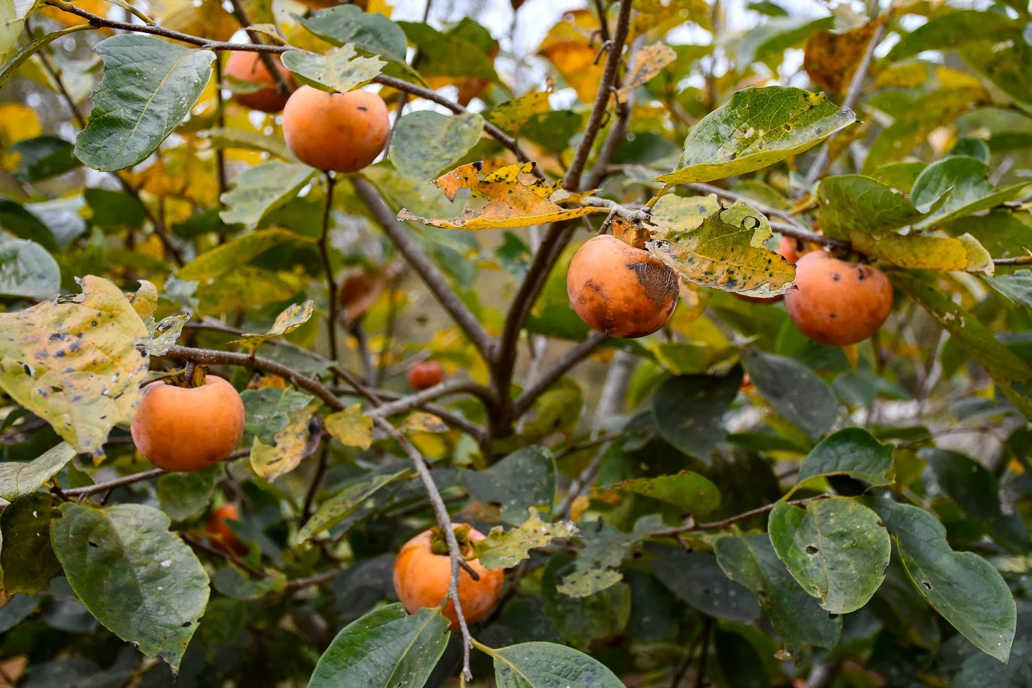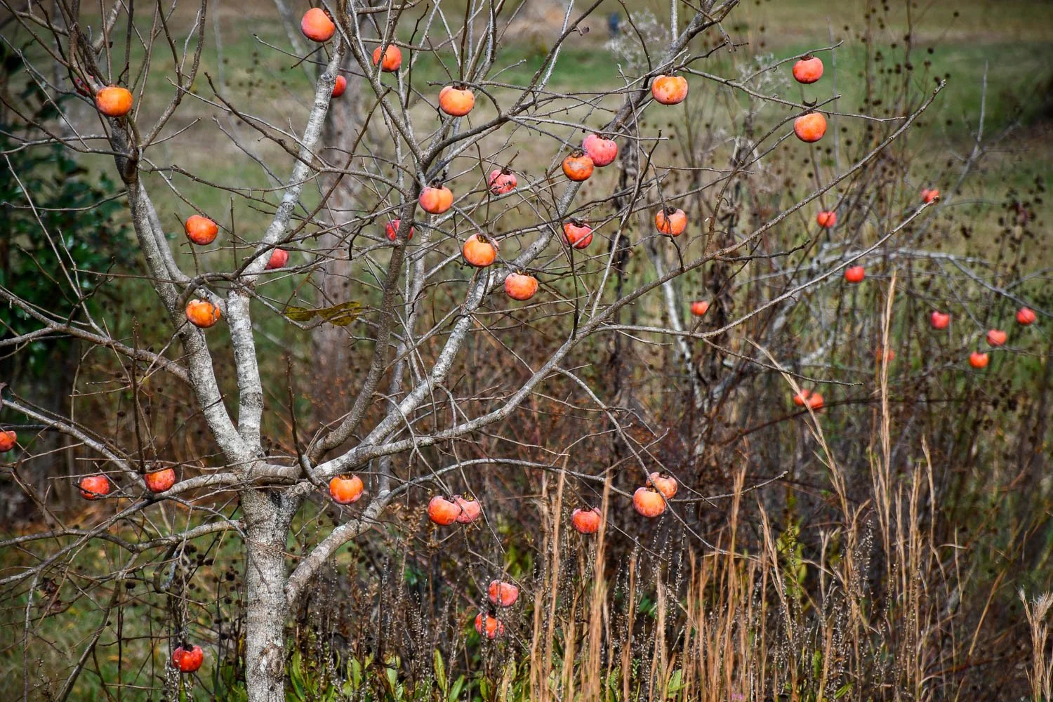 The orange orbs of Diospyros NIKITA’S GIFT begin turning ripe. The leaves have just begun to fall, and with first frost leaves will drop and better reveal the fruit.