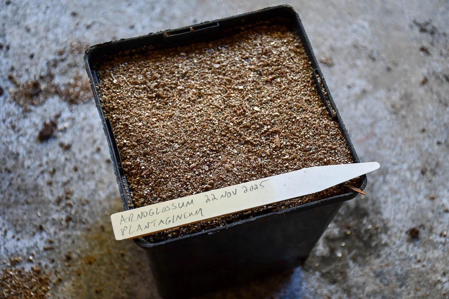 Arnoglossum plantagineum (prairie Indian plantain) sown in a larger pot. Once the seedlings germinate, I can tease them apart and pot them into larger containers.