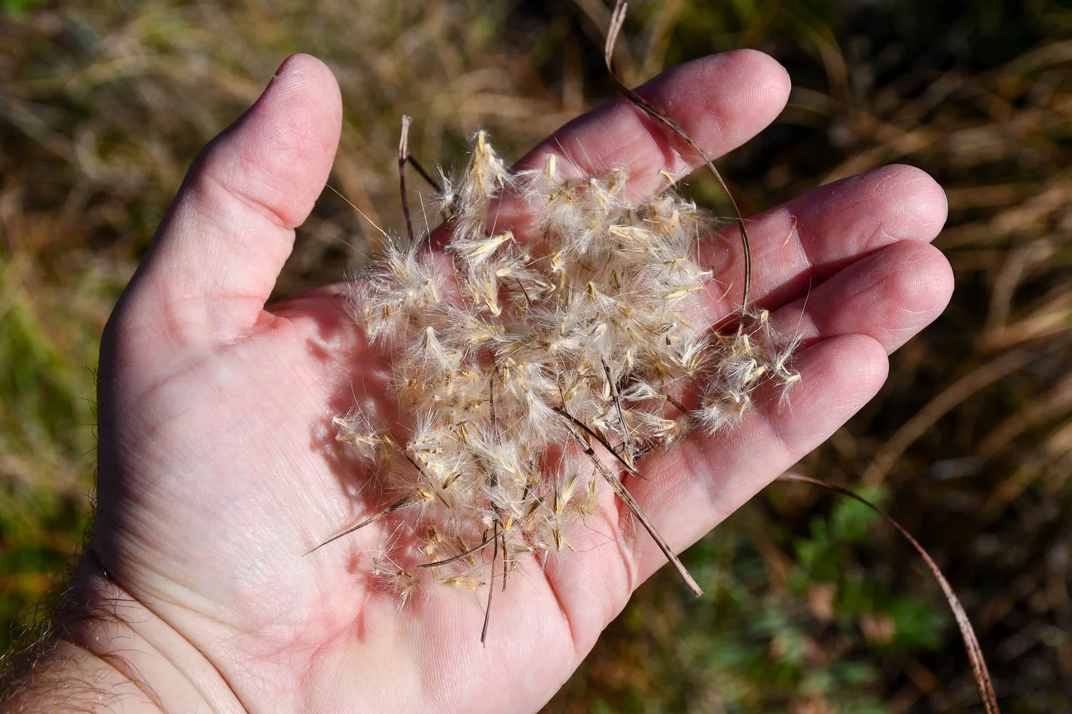 Sometimes during Sowvember I go into the wild to glean. I went out the other afternoon and collected seed on some back roads for more native grasses at Ephemera Farm. I was mainly hunting Tridens flavus (purpletop) and Andropogon ternarius (split-beard bluestem, header image), and I had already filed away a few spots that the mower had missed. I sat a cardboard box down beside me, grabbed the culm just below the seed, ran my gloved hand up, and released the seed into the container. After a few minutes I had a decent handful or two of seed for sowing. I try not to be too greedy, and like manna in the wilderness, I collect just enough for me.