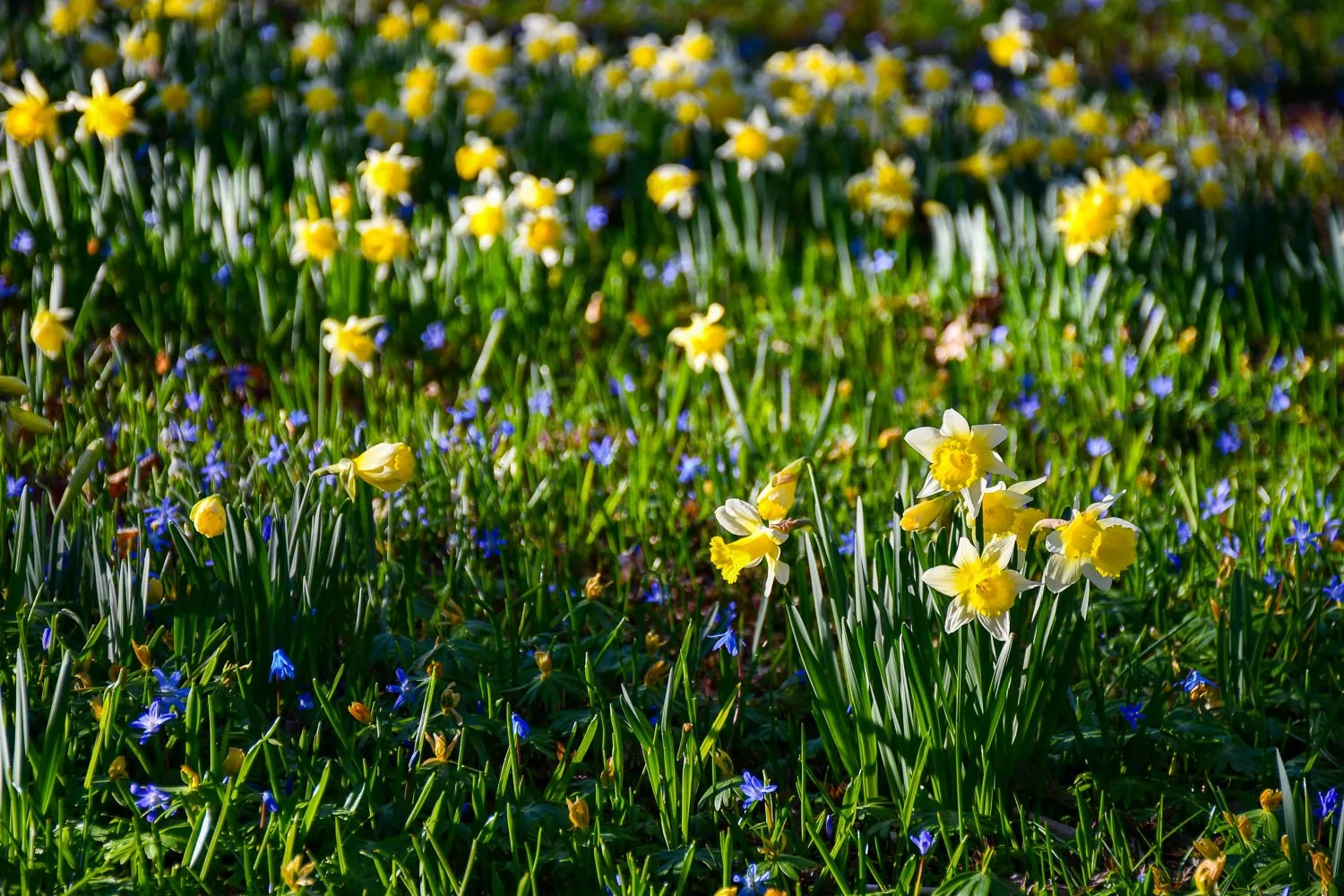 A lovely unknown variety of Narcissus (daffodil) provides pops of color on the March Bank.